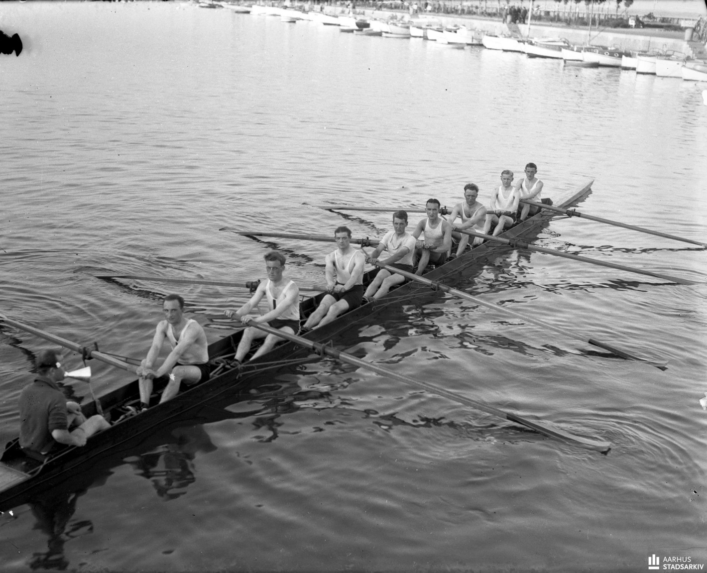 Otter med roere og styrmand i Aarhus Lystbådehavn. Fotograf Aage Fredslund Andersen, ca. 1935, Aarhus Stadsarkiv.