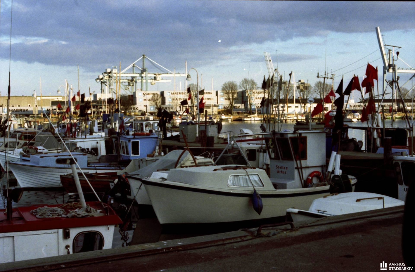 Udsigt fra Slæbestedet over Lystbådehavnen. I baggrunden ses Nordhavnen med Mærskcontainere og kraner. Fotograf Peter Thyssen, 1997, Aarhus Stadsarkiv.