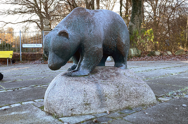 The bear is a popular bronze sculpture at Chr. Filtenborgs Plads. The bear is created in 1956 by Carl Lobedanz (1907-1987). Notice how the back of the small bronze bear is shiny. It is due to many years of children riding on its back when passing by the sculpture.