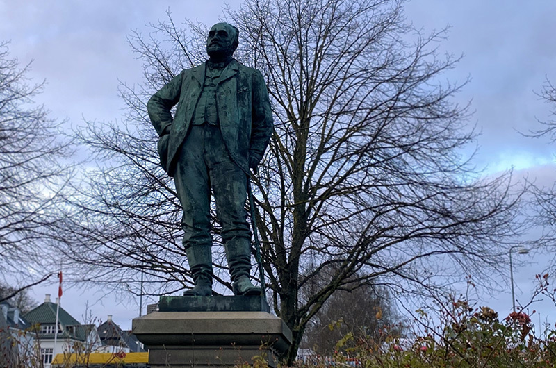 Enrico Mylius Dalgas initiated the establishment of Det danske Hedeselskab (the Danish Society for Moorland Development). He worked with the engineering corps' road service in 1854, where he became familiar with nature areas and their geological conditions, and he closely followed the unsuccessful attempts to cultivate the large heathland areas in Jutland. Enrico died in 1894 in Aarhus and is buried in Nordre kirkegård. After his death, Hedeselskabet, launched a national fundraising campaign, followed by a competition that ensured the completion of a bronze statue by sculptor Rasmus Andersen (1861-1930), which was presented in Aarhus at a grand celebration on July 16, 1901. The statue has stood in multiple locations. On March 23, 1938, the statue took its current position at the southern end of Dalgas Avenue.