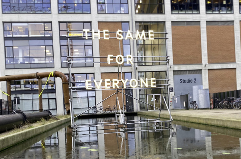 The renowned Scottish artist Nathan Coley (1967-) has created a series of luminous artpieces that connects the region from east to west by the use of mythical light manifestations. The title THE SAME FOR EVERYONE draws attention to one of Denmark's most cherished values, namely "equality for all," and the idea for the pieces text/title, and theme originated during one of Nathan Coley's trips to Central Jutland, where he visited Friland and saw an old sign with the text "Ens for alle" ("The Same for Everyone"). The artwork in front of Filmbyen was launched when Aarhus was European Capital of Culture in 2017.