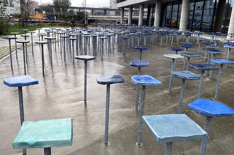 In 2020, Tove Storch (1981-) created an artwork for Jyllands-Posten's new headquarters in Sydhavnen. The 550 ceramic tiles each have their own shape and size. The tiles are glazed in many different shades of blue and spread out in the new headquarters, occupying the space around the building. At first glance, viewers of the new headquarters see a blue sea of organically shaped tiles floating above the base. But the art piece also invites the artviewer to use it; perhaps as a maze or as a table for summer gatherings amongst colleagues or at friday bars.