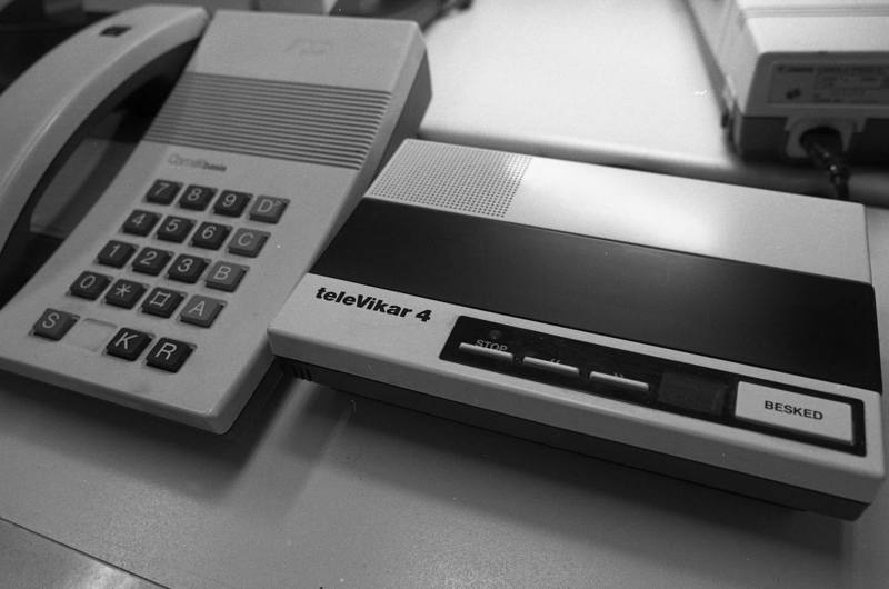 I 1977 lancerede Jydsk Telefon verdens første fuldelektroniske trykknaptelefon, 76E. Modellen, der her er fotograferet med en telefonsvarer i 1991, blev så berømt, at den i dag er udstillet på The Museum of Modern art, MOMU, i New York.