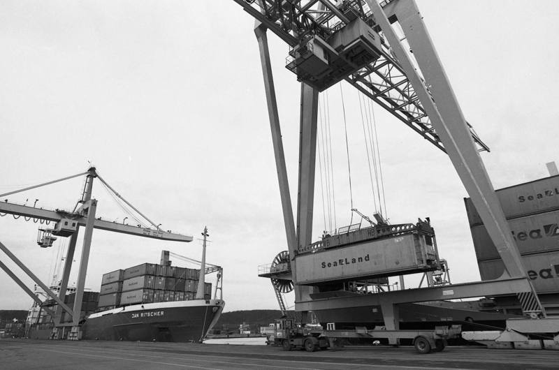 Der er travlhed det meste af døgnet i Aarhus Havn, hvor skibe lastes og losses med containere. Siden midten af 1980’erne, hvor billedet er fra, er havnen vokset til landets største. Foto: Pressefotograf Jens Tønnesen, Aarhus Stadsarkiv.