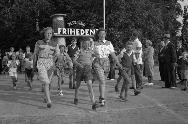 Århus Stiftstidendes arkiv indeholder fotografier fra slutningen af 1930’erne og frem. Arkivet er en guldgrube i forhold til billeder fra besættelsestiden, og det er heldigvis ikke krig og ødelæggelse det hele. Deltagelse i algang var under besættelsen en måde at vise sit nationale sindelag, og landet over blev der under besættelsen afholdt flere af disse gåkonkurrencer. I Aarhus var der i 1942 både start og mål ved Restaurant Friheden – i dag Restaurant Terrassen i Friheden.