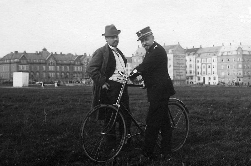 Øverste billede: Politimester Goll og politiassitent Hauerbach ved området omkring Dalgas Avenue ca. 1908. I baggrunden ses Sct. Josephs Hospital på Tietgens Plads. Ukendt fotograf, Den Gamle By.