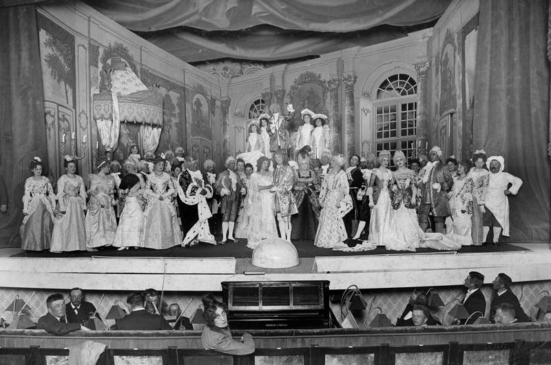 Øverste billede: Generalprøve på Prinsessen på ærten, der var åbningsforestilling ved teatrets indvielse i 1900. Fotograf A.B. Thun, Aarhus Teater.