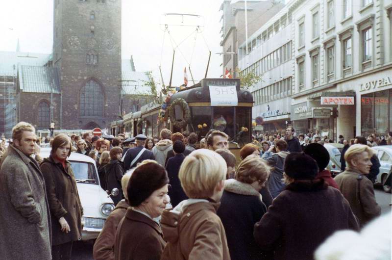 Øverste billede: Aarhusianerne er mødt talstærkt frem på Store Torv for at tage afsked med sporvognen, der kørte de sidste ture gennem byen søndag 7. november 1971. Fotograf Ole Olesen, Aarhus Stadsarkiv.