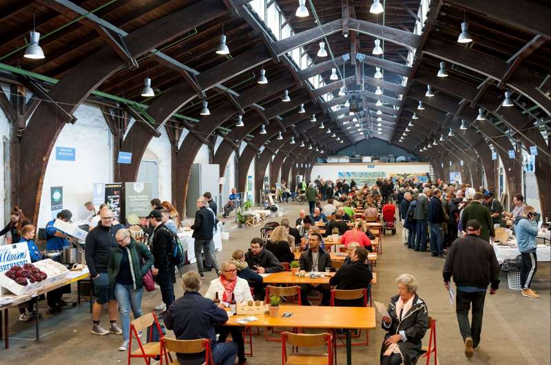 Øverste billede: De gamle haller på Godsbanen har efter DSB’s lukning af stedet lagt lokaler til mangt og meget. Her er vi til østersfestival i 2017. Fotograf Ib Nicolajsen, Aarhus Stadsarkiv.