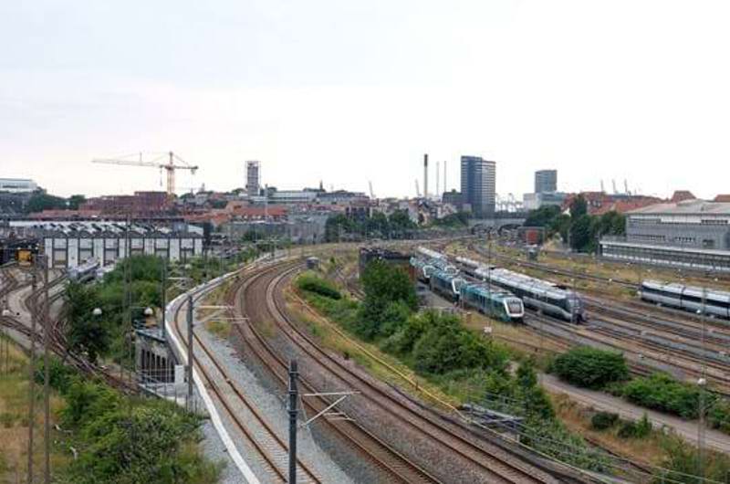 Billede: Jernbaneterrænet som det ser ud i dag fotograferet fra Ringgadebroen. Fotograf: Ib Nicolajsen, 2018, Aarhus Stadsarkiv.