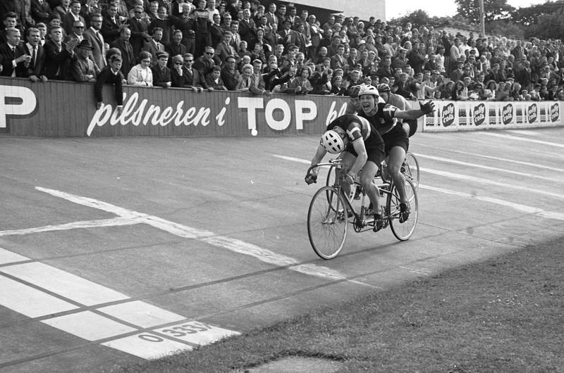 Foto: I juni 1964 var cykelbanen vært for det europæiske grand prix i tandemcykel. For de mange fremmødte aarhusianere blev der masser at juble over, da hjemmeparret Per Sarto og Niels Fredborg vandt grand prix’et. Der var ellers tvivl, om de to overhovedet ville kunne stille til start efter, at de begge blev godt forslået efter et styrt i opvarmningen. Fotograf Jørn Timm, Aarhus Stadsarkiv, 1964.