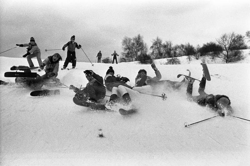 Billede: Store mængder decembersne i 1981 gjorde livet surt for bilister, men bragte til gengæld glæde til byens børn. Børn og pædagoger fra Byggelegepladsen fra Musvågevej tog 22. december turen ud til Hørhaven, hvor sneen lå tyk og hvid. Julen i 1981 blev en af de i alt blot syv landsdækkende hvide jule i det 20. århundrede. Billedet kan også opleves i den netop udkomne bog om Aarhus i 1980’erne. Bogen er fjerde del i serien ”Aarhus i årtier – Aarhusianernes historie fortalt i billeder”. Fotograf: Preben Hupfeld, 1981.