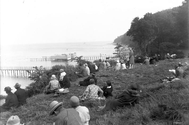 Foto: Sommergæster nyder udsigten fra skrænten, hvor Helnan Marselis Hotel ligger i dag. Neden for skrænten ses en af byens attraktive badeanstalter samt anløbsbroen til Varna. Hammerschmidt Foto, Aarhus Stadsarkiv, ca. 1925.