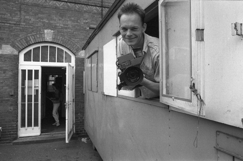 Billedtekst: I næsten ti år hørte Aarhus Filmværksted til i lokaler på Carl Blochs Gade indtil sommeren 1992, hvor de flyttede til Jægergårdsgade 152. Glæden og kreativiteten var stor i de gamle lokaler. Fotograf Jens Tønnesen, 1990.