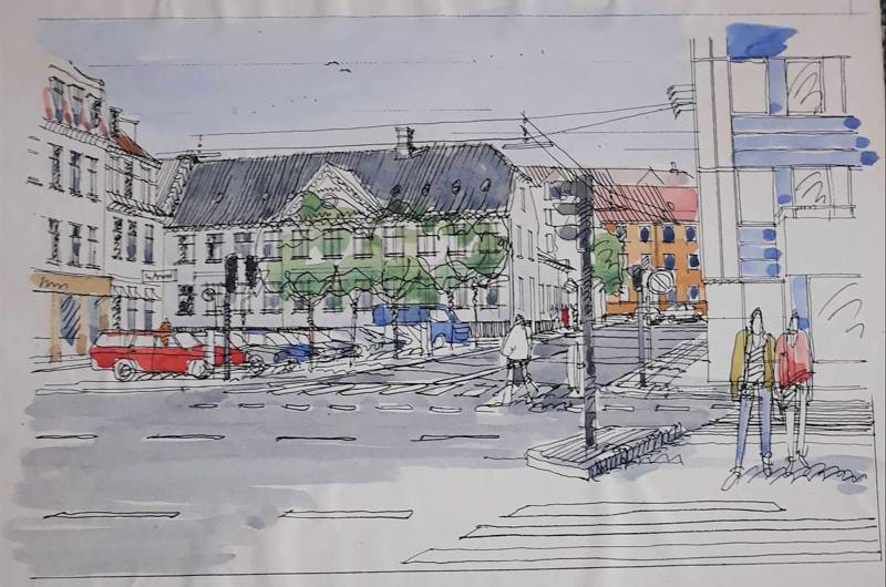 Illustration: Man kan blandt andet finde flere af disse håndtegnede illustrationer udarbejdet af Stadsarkitektens Kontor i forbindelse med trafikomlægningen i den indre bys sydlige del. Her er vi på hjørnet af Mindebrogade og Åboulevarden i en nutidsversion og fremtidsvision. 1994.