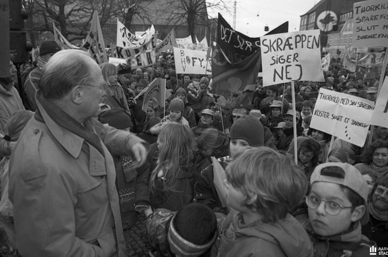Billedtekst: Ikke alle kommunale beslutninger er blevet taget lige godt imod. Her stiller borgmester og formand for Kommunernes Landsforening Thorkild Simonsen, Aarhus, op til en snak med børn og demonstrerende medarbejdere fra kommunens daginstitutioner i 1995. De var utilfredse med et fremlagt spareforslag. Foto: Jens Tønnesen, Aarhus Stadsarkiv, 1995.