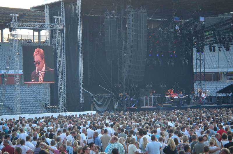 Billedtekst: 9. juli 2005 gav den 58-årige verdensstjerne Elton John koncert på stadion. Det blev Atletions første succesfulde stadionkoncert med 25.000 tilskuere, der havde betalt mellem 495 og 795 kr. for billetterne. Fotograf Peter Thyssen, 2005, Aarhus Stadsarkiv.