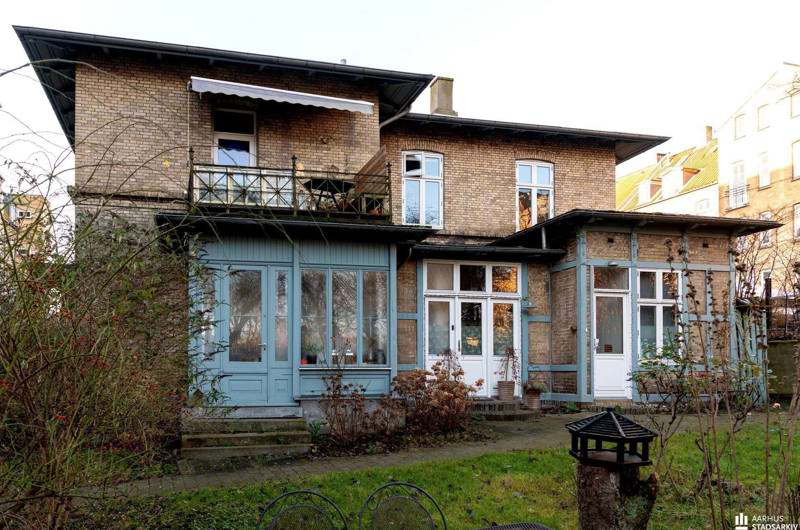 Øverste billede: Nogle af byens villaer kan ikke ses fra vejen. Gemt væk bag senere opførte etageejendomme ligger de som skjulte perler i baggårde. En af disse villaer er Villa Derby med adresse på Thunøgade 26B. Villaen er en toetagers gulstensvilla, der blev opført i 1884 for købmand Adam Nielsen. I anledning af købmandens guldbryllup i 1904 kunne man læse følgende notits i Stiftstidende: ”A. Nielsen har ikke deltaget i det offentlige Liv, men desuagtet er han og hans Hus kendt og agtet blandt alle Aarhusianere, et anset Patriciershjem fra den gode gamle Tid, hvor Gæstfrihed og Godgørenhed er karaktermærket”.