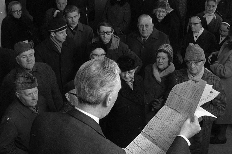 Billedtekst: Borgmester Bernhardt Jensen åbner kommunalvalget på Ingerslev Boulevards Skole. Afholdelsen af valget i den nye storkommune var fyldt med udfordringer. Det fik Bernhardt Jensen at selv at mærke, da han i første omgang blev nægtet at afgive sin stemme, fordi han ikke stod i valgbogen. Det viste sig dog hurtigt, at bøgerne blot var blevet forbyttet ved bordene. Fotograf Jørn Timm, 1970, Aarhus Stadsarkiv.