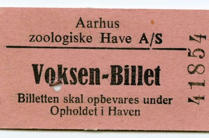 Øverste billede: Med denne lille lyserøde billet i hånden var der adgang til en eksotisk verden blot få minutters cykeltur fra Banegårdspladsen. Aarhus Zoologiske Have slog dørene op for publikum 1. maj 1932. Indgangen lå overfor Frihedens indgang ved krydset ved Stadion Allé og Skovbrynet og haven var de første år en stor publikumssucces med 200.000 gæster i den første sæson alene.