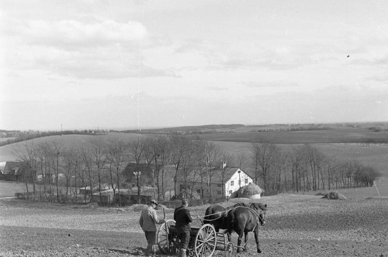 Billede: To mænd og et hestespand sår en mark i Holme Bjerge en forårsdag i 1954. Fotograf Børge Venge, 1954, Aarhus Stadsarkiv.