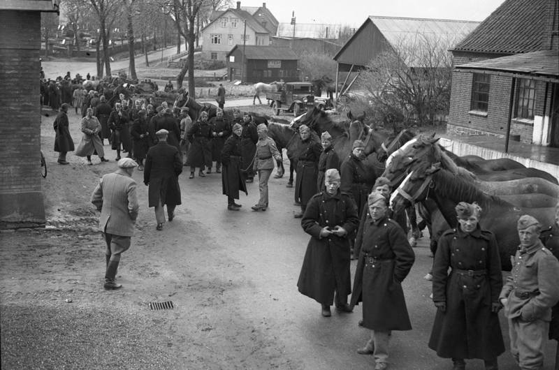 Billede: 9. Artilleriafdeling på besøg i Borum 15. april 1940, hvor 75 heste skulle udstationeres til brug i landbruget. Ukendt fotograf, Århus Stiftstidende, Aarhus Stadsarkiv.