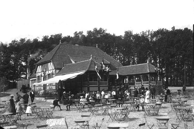 Billedtekst: Restaurant Friheden – i dag restaurant Terrassen – var starten af 1900-tallet et yndet udflugtsmål for aarhusianerne. Her er vi ved skovpavillonen på en sommerdag i 1908. Fotograf Edvard Monsrud, 1908, Aarhus Stadsarkiv.