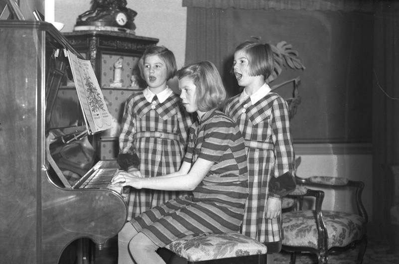 Øverste billede: Stiftens fotograf har bevæget sig inden for hjemmets fire vægge i 1940, hvor to søstre synger ”Højt fra træets grønne top”, mens storesøster spiller for på klaveret. Sangen, der er fra 1847 og skrevet af Peter Faber, er stadig i dag et sikkert hit i de fleste danske hjem, når der skal danses om juletræet.