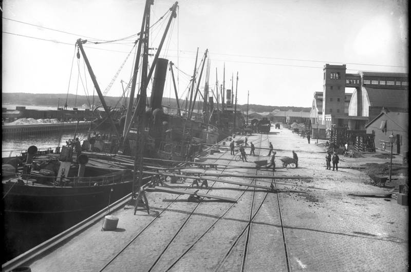 Billede: Arbejde på kajen ud for Aarhus Oliefabriks havneanlæg. Fragtskibe bliver lastet med kopra. Set mod syd. Formodentlig fotograferet fra taget af en jernbanegodsvogn. Foto: Ukendt skaber, Aage Fredslund Andersens fotosamling, Aarhus Stadsarkiv. 1918.