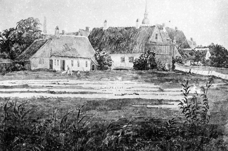 Billede: Udsigt fra Bispetorvet over Aarhus Å mod Blegdammen og Vor Frue Kirke. Efter akvarel af Bertha Weis, 1860, Den Gamle By.