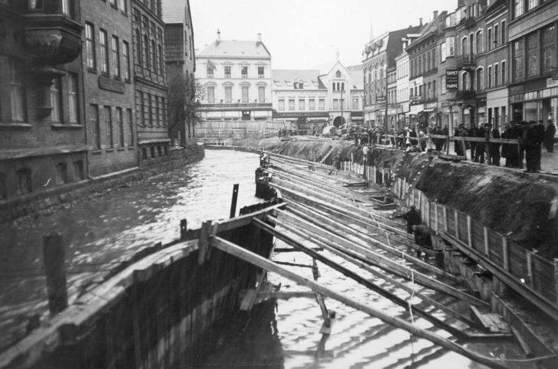 Billede: Det begyndende arbejde med overdækning af åen. Set fra Skt. Clemens Bro mod Immervad og Magasin Du Nord. Fra åens kant betragter tilskuere arbejdet med åen. Stadsingeniørens Kontor, 1933, Aarhus Stadsarkiv.