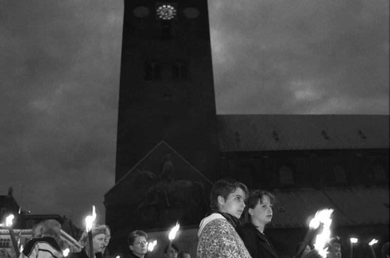 Billede: Fakkeloptog på Bispetorvet i maj 1993 for at mindes aids-ofrene. Fotograf Jens Tønnesen, 1993, Aarhus Stadsarkiv.