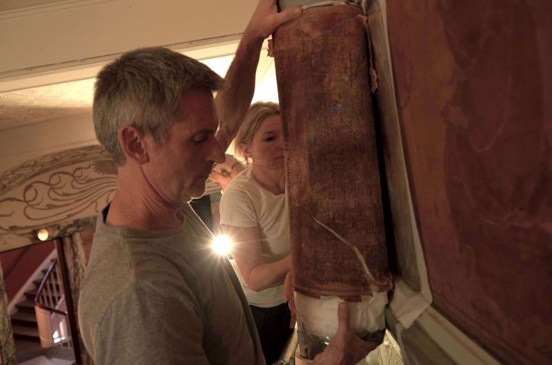 Billede: Konservatorerne Christian Balleby og Mette Krag Nørgaard i gang med den forsigtige afrulning og nedtagning af friserne. Fotograf: Mikkel Cantzler Christensen, 2021 Aarhus Teater.