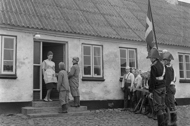 Billede: I Tilst-Kasted Kommune blev der endnu i 1960’erne holdt liv i den gamle østjyske tradition med fastelavssoldater. Kommunens drenge travede rask hele kommunen rundt på fastelavnssøndag anført af en konge og en kronprins. Ved hver husstand blev der sunget til gengæld for en skærv i indsamlingsbøssen. De indsamlede penge blev brugt til en fest på fastelavnsmandag i Tilst Forsamlingshus, som alle skolebørn i de besøgte huse blev inviteret til. Foto: Jørn Timm, 1961, Aarhus Stadsarkiv.