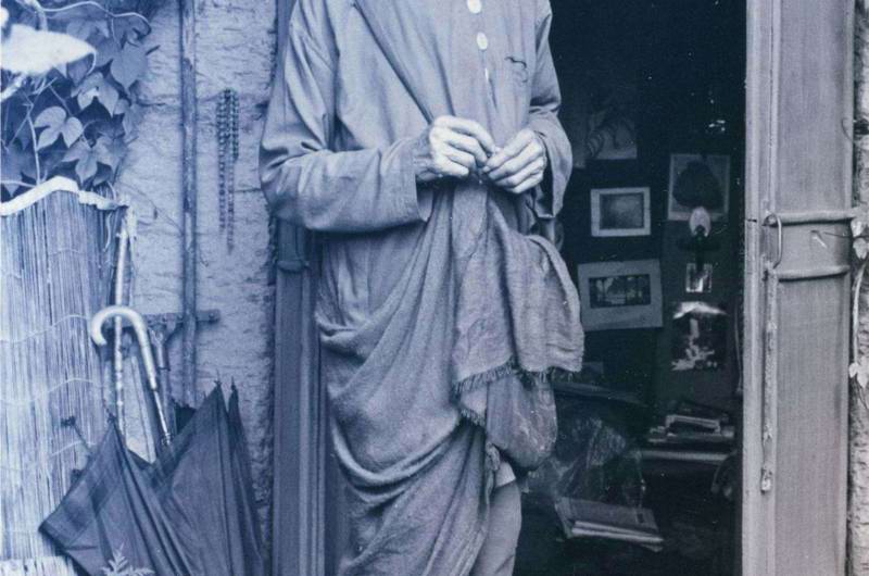 Billede: Sunyata foran sit hjem i Indien i 1973, fotograf Maggie Hopp, 1973, Aarhus Stadarkiv.