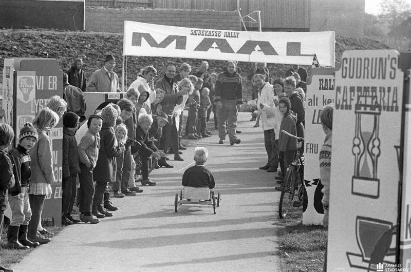 Billede: Der var gang i rugbrødsmotoren i oktober 1968, da der blev der afholdt sæbekasserally ved handelscentret i Lystrup. Foto Jørn Timm, 1968, Aarhus Stadsarkiv.
