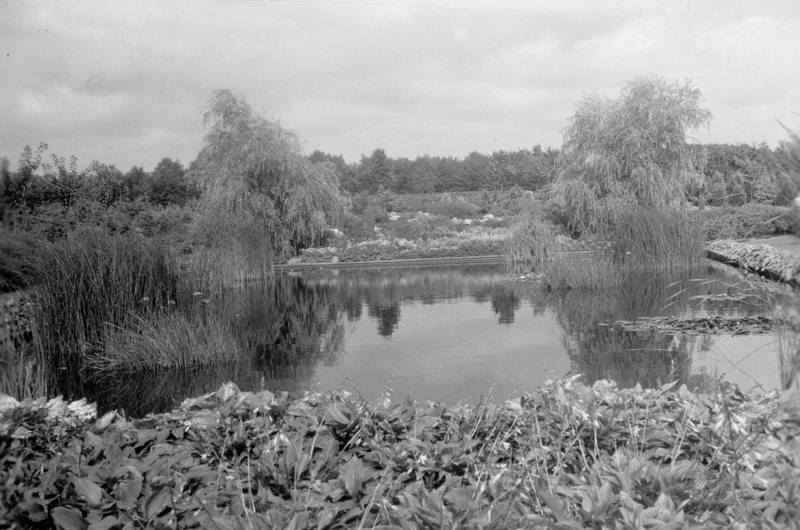 Billede: Rømerhavens åkandedam blev anlagt med masser af siv og hostaer. I dag er disse væk, så dammen har fået et helt andet udtryk med skarpe stenkanter. Foto Stadsingeniørens Kontor, ca. 1930, Aarhus Stadsarkiv.