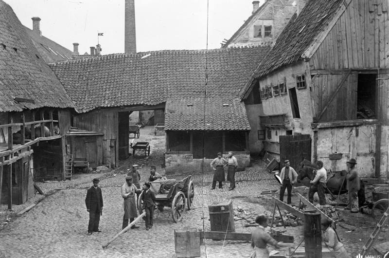 Billede: De store købmandsgårde var travle arbejdspladser for rigtig mange af byens indbyggere i 1800-tallet. Her er det Marcus Galthen Bechs gård i Badstuegade, hvor Borgporten i dag er opført. Hammerschmidt Foto, 1890, Aarhus Stadsarkiv.