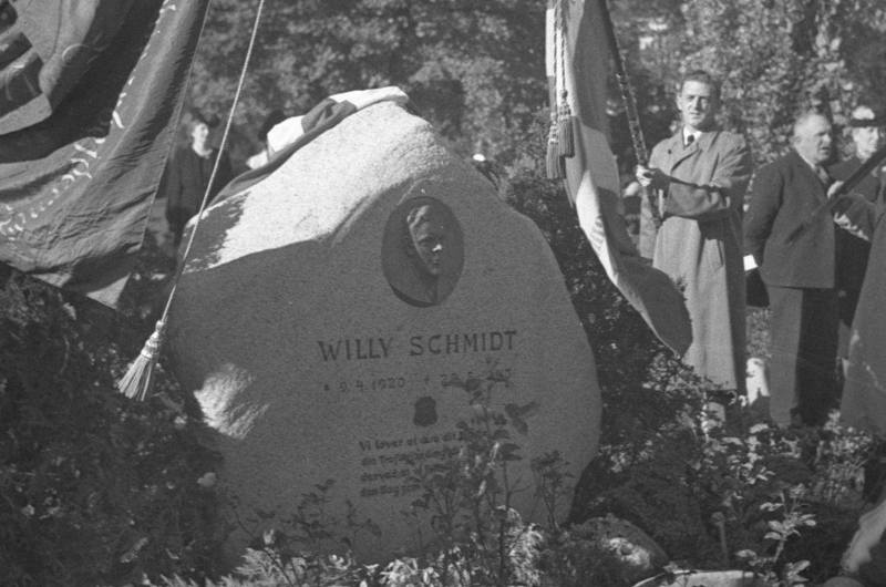 Billede: Afsløring af mindestenen for Willy Schmidt. Ukendt fotograf, bragt i Århus Stiftstidende, 10. august 1945.