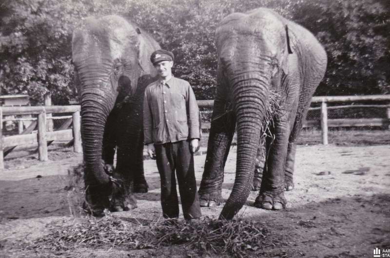 Billede: Dyrepasser Ingvard P. Larsen stående foran to elefanter i Aarhus Zoologiske Have. Fotograf Edith Larsen, ca. 1955, Aarhus Stadsarkiv.