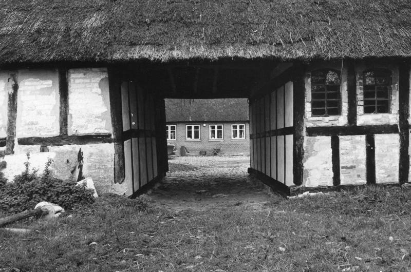 Billede: Kig gennem port i sydlig udlænge på Ormslevvej 227, Slattenbjerggård. Fotograf Jens Kjeldsen, 1975, Aarhus Stadsarkiv.
