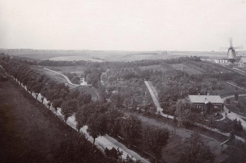 Billede: Det Jydske Haveselskabs have, som senere blev til Botanisk Have og Den Gamle By. Her fotograferet i 1890. I forgrunden ligger Viborgvej, og til højre i billedet ses plantørboligen med Vesterbro Mølle i baggrunden. Fotograf ukendt, 1890, Aarhus Stadsarkiv.