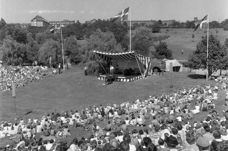Billede: Parkunderholdning var et populært arrangement for børn og voksne. Her er friluftsscenens tilskuerpladser indtaget en sommerdag i 1959. Fotograf Børge Andre Venge, 1959, Aarhus Stadsarkiv.