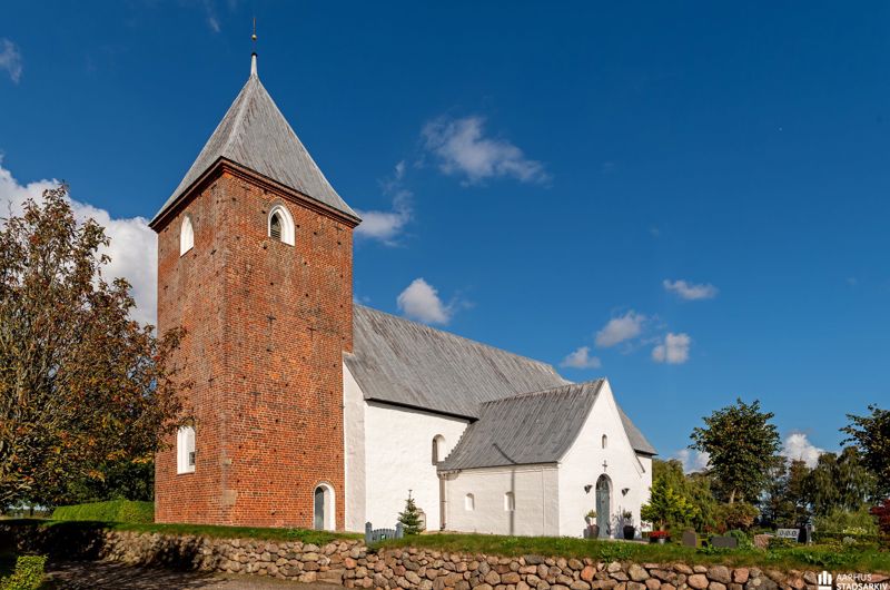 Billede: Framlev Kirke blev bygget i 1100-tallet, hvor det romanske kor og skib blev opført i kløvede marksten og frådsten. Fotograf Ib Nicolajsen, 2021, Aarhus Stadsarkiv.