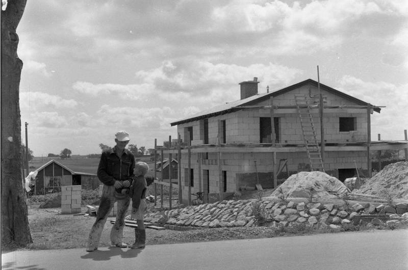 Billede: Selvbygger opfører hus i gasbeton i Hasselager. Fotograf Børge Venge, 1956, Aarhus Stadsarkiv.