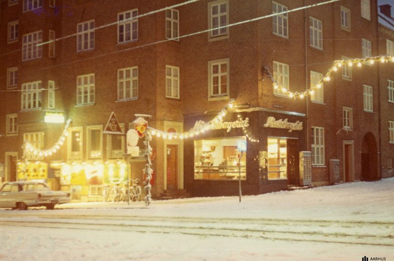 Billede: Med sne og julelys var juleidyllen i top ved Mønsterbageriet på hjørnet af Tordenskjoldsgade og Herluf Trolles Gade i 1967. Fotograf Lars Christian Brink Christensen, 1967, Aarhus Stadsarkiv.