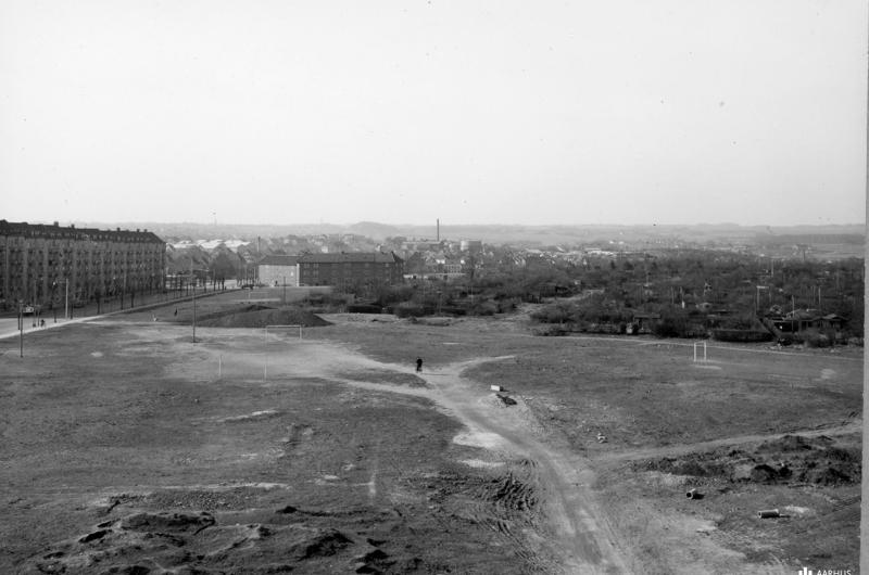 Billede: Langenæs før etagebyggerierne, her i 1953 med boldbaner og kolonihaver. Til venstre i billedet ses Skanderborgvej og længere ude i forgrunden Kongsvang og Viby. Fotograf Hammerschmidt Foto, 1953, Aarhus Stadsarkiv.