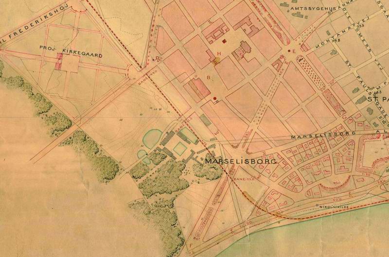 Billede: Udsnit Aarhus-by-og-Marselis-jorder-1898: Udsnit fra Kampmann og Ambts store plan fra 1898 over udviklingen af købstadens nyerhvervede områder. På kortet ses Marselisborg med dets længer omgivet af små søer. Område skraveret med lyserødt er endnu ikke realiserede planer. Som det ses, forestillede de to arkitekter sig, at et villakvarter skulle opføres på området, hvor vi i dag har Strandparken. Kilde: ”En del af Aarhus By og Marselisborgs Jorder. Udkast til Bebyggelse m.m.” Kampmann & Ambt, 1898, Stadsingeniørens Kontor, Aarhus Stadsarkiv.