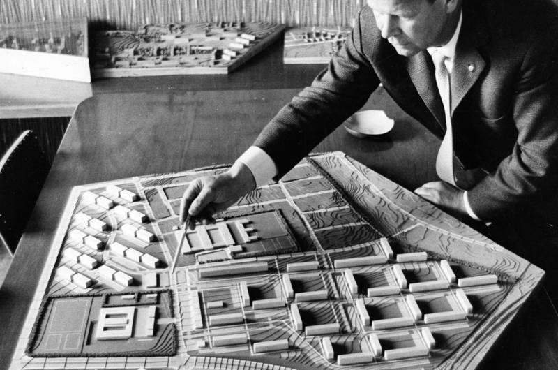 Billede: Model af kvartererne Søndervangen, Kjærslund og Rosenhøj præsenteres af kommuneingeniør H. Arnum. Fotograf Børge Venge, 1968, Den Gamle By.