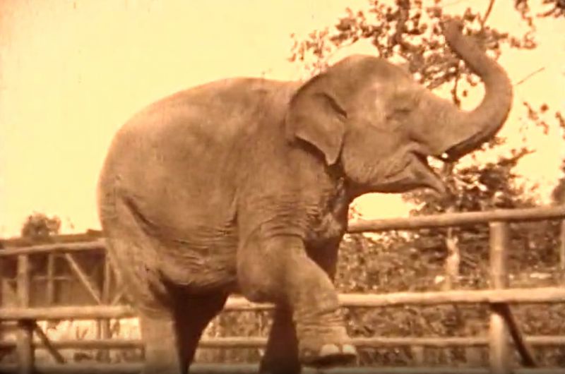 Billede: Elefant i Aarhus Zoologiske Have, der lå i Havreballeskoven over for Tivoli Friheden. Screenshot fra filmen.